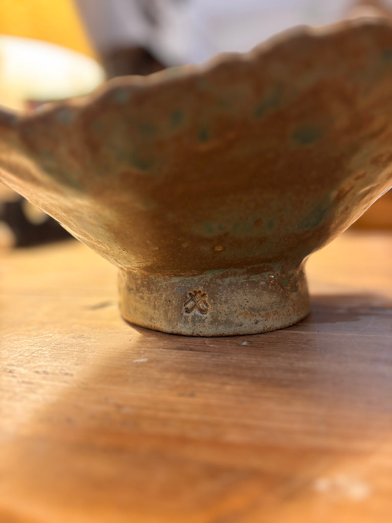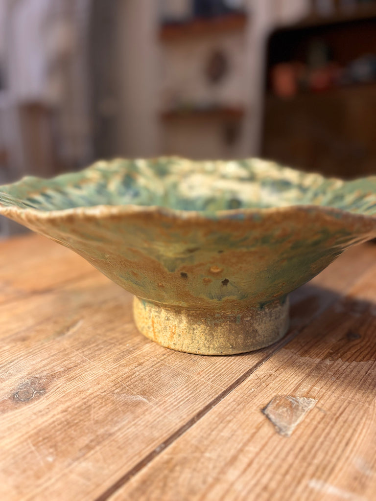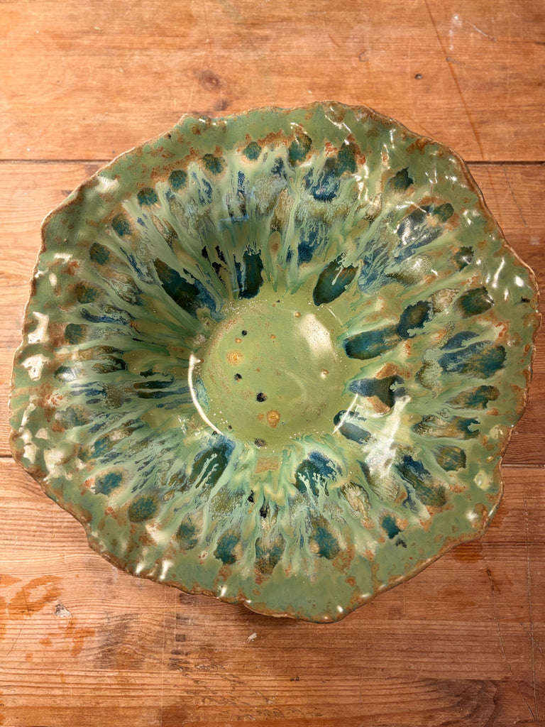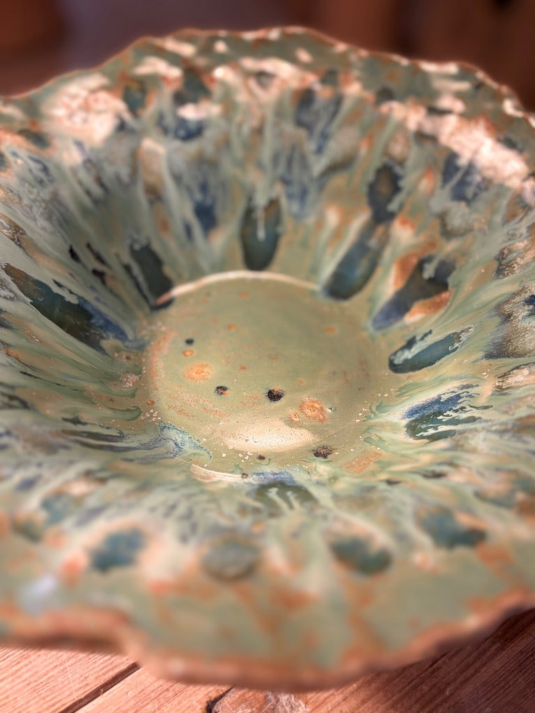 Fuente en gres esmaltado de NareCeramic. Pieza única modelada a mano en gres y esmaltada en alta temperatura, con un precioso acabado en tonos verdes y azules que recuerdan al plumaje del pavo real. Su textura orgánica y borde irregular hacen que cada fuente sea irrepetible, ideal como frutero, centro de mesa o elemento decorativo que aporta frescura y carácter artesanal al hogar.