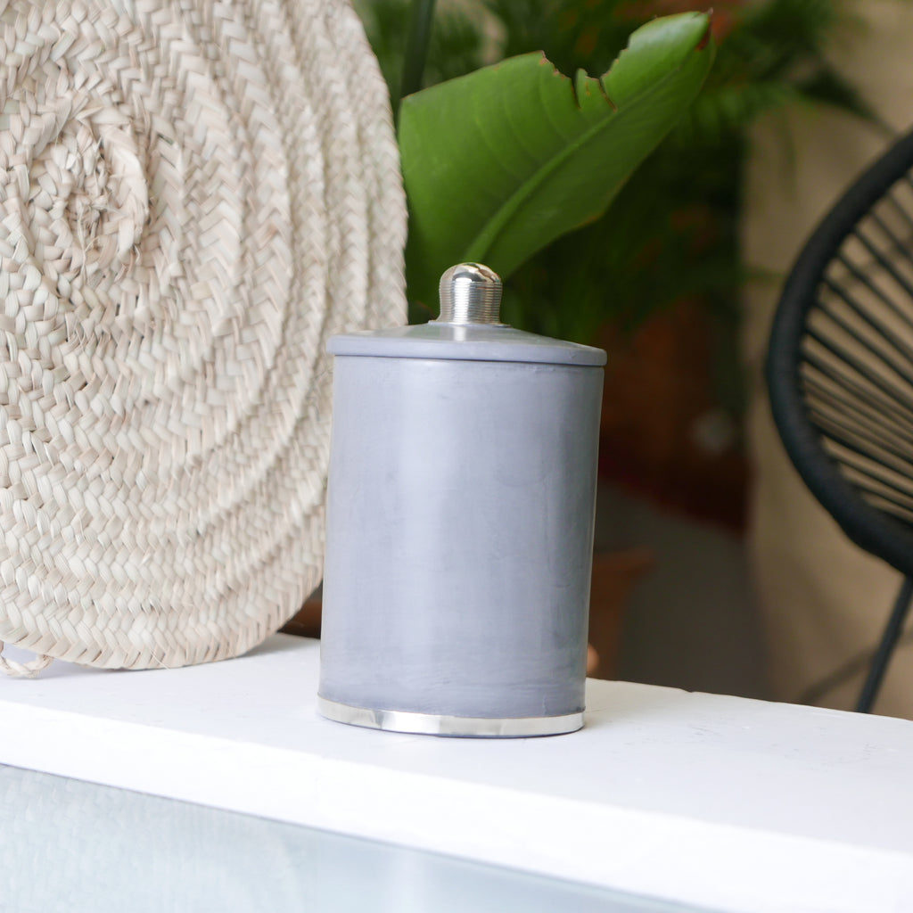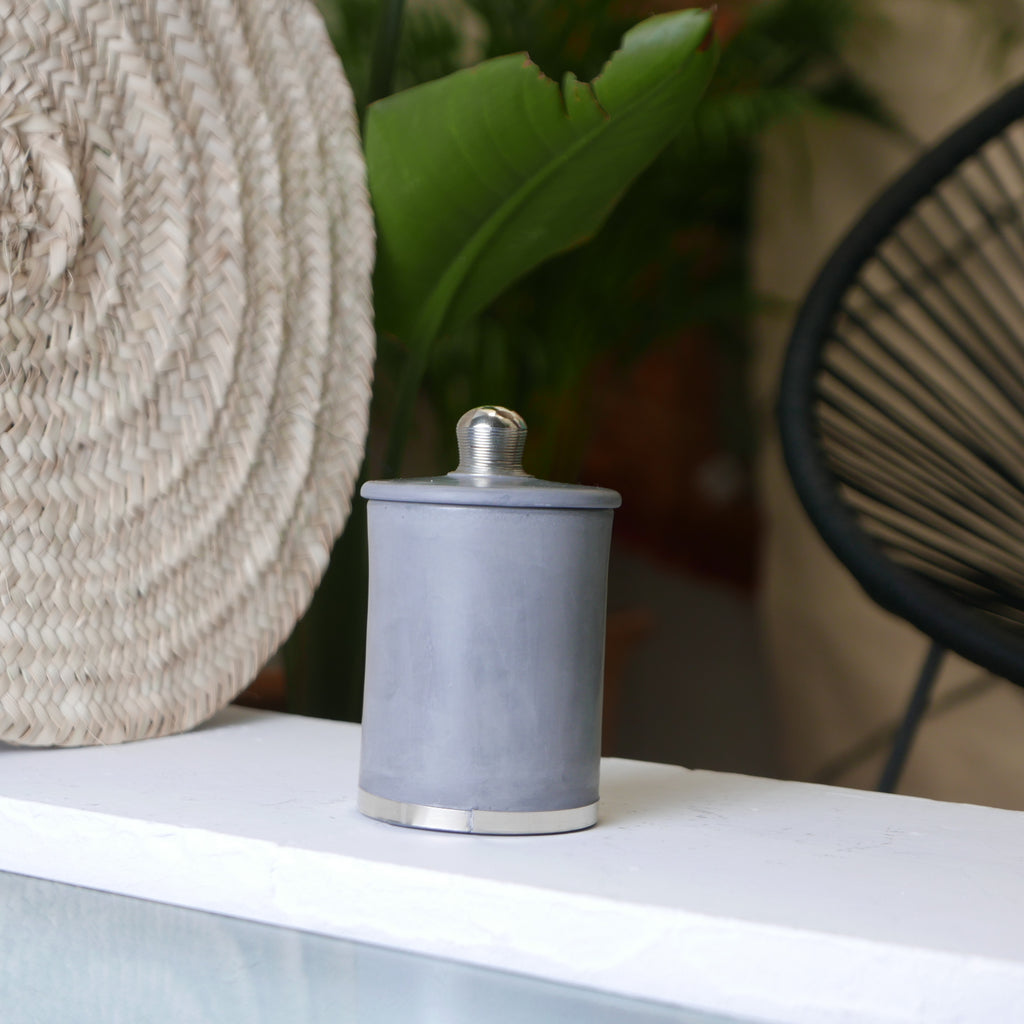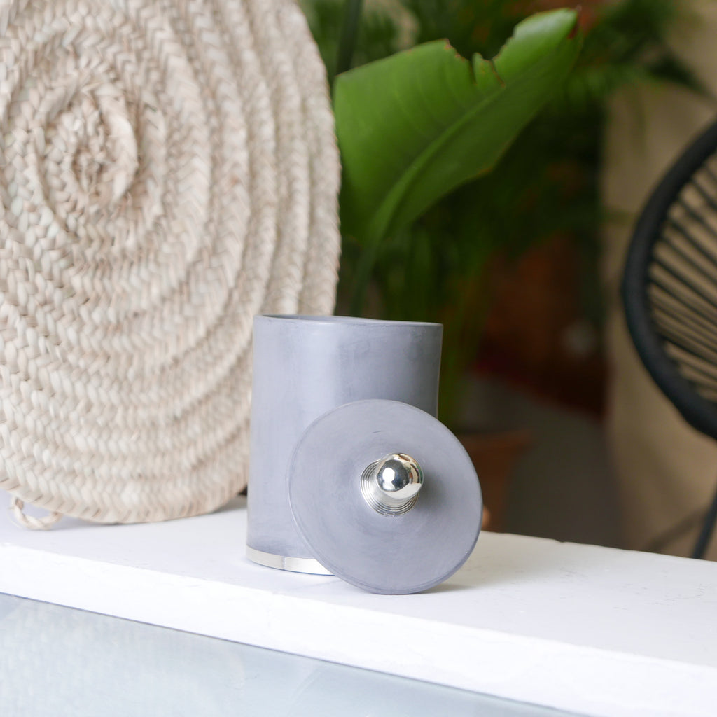 Caja de cerámica terminada en Tadelakt gris con detalle metálico plateado en la tapa así como en la base.