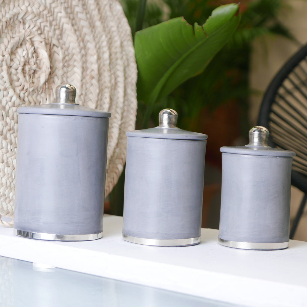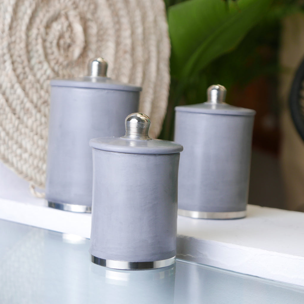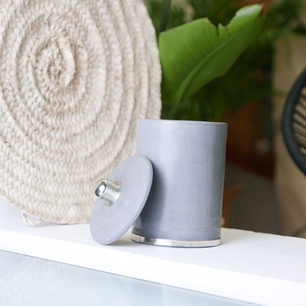 Caja de cerámica terminada en Tadelakt gris con detalle metálico plateado en la tapa así como en la base.